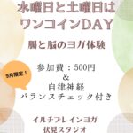 2025年11月1日 / 最終更新日時 : 2025年11月1日 fushimi_admin 体験会 11月の水曜日と土曜日はワンコイン500円体験DAY! 毎週水曜日と土曜日は「呼吸・瞑想のためのヨガ」をワンコイン500円で体験できます! キーポイントは「腸・脳・丹田!」リラックスしたい方、体をスッキリさせたい方、自分を変えたい方にオススメです!スタッフ一同、心よりお待ちし […]